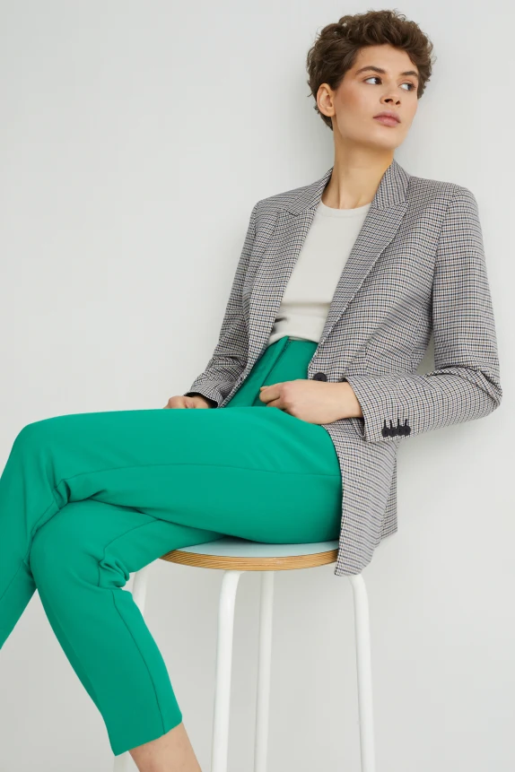 Stretchy blazer with shoulder pads made of finely structured fabric. Two front flap pockets and smooth inner lining.